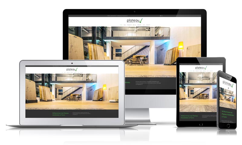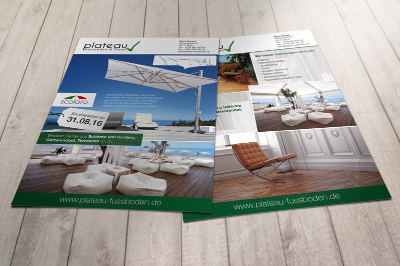 Konzeption, Design und Druck eines Din A4 Flyers für Plateau Holzböden & Türen in Bonn. Natürlich wurde auch deren Webseite von uns gestaltet und programmiert. Auch die Geschäftsdrucksachen (Briefbögen und Visitenkarten etc.) wurden von uns designt und gedruckt.